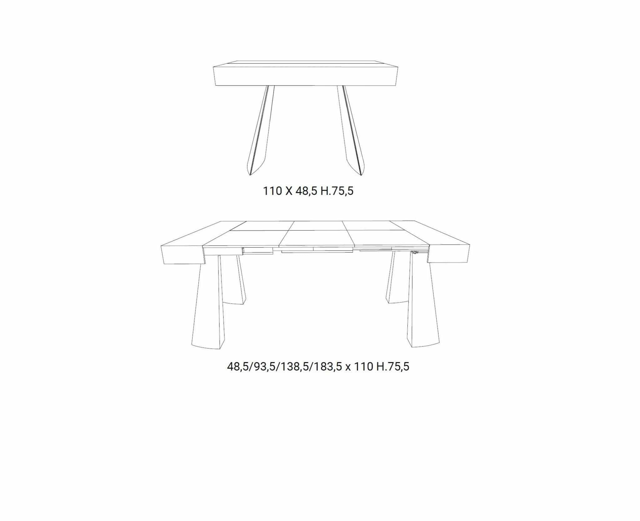 Consolle allungabile dotata di 3 prolunghe incorporate nel piano. Meccanismo telescopico in alluminio, gambe in metallo. Piano e allunghe in legno.