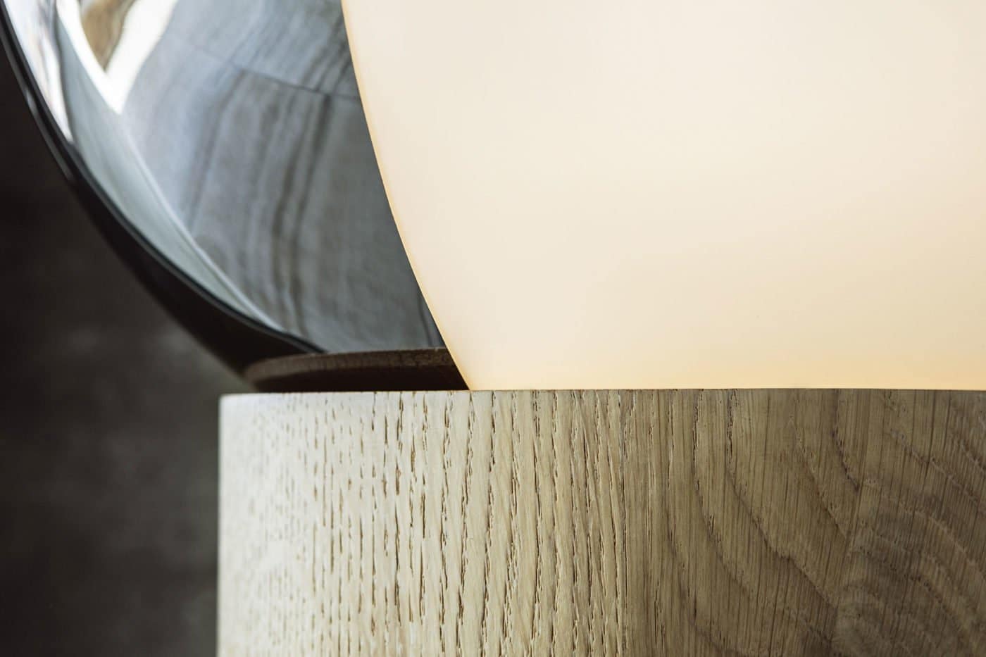 La lampada Je Suis da tavolo รจ caratterizzata da una base cilindrica leggermente sfaccettata disponibile in marmo oppure in legno a due finiture. Lโimportante ed esuberante base sostiene un diffusore sferico in vetro per metร bianco e metร in argento. La molteplicitร di elementi come di materiali e stili rendono questa lampada abbastanza confusa, una confusione perรฒ organizzata che รจ in grado di renderla estremamente attraente.