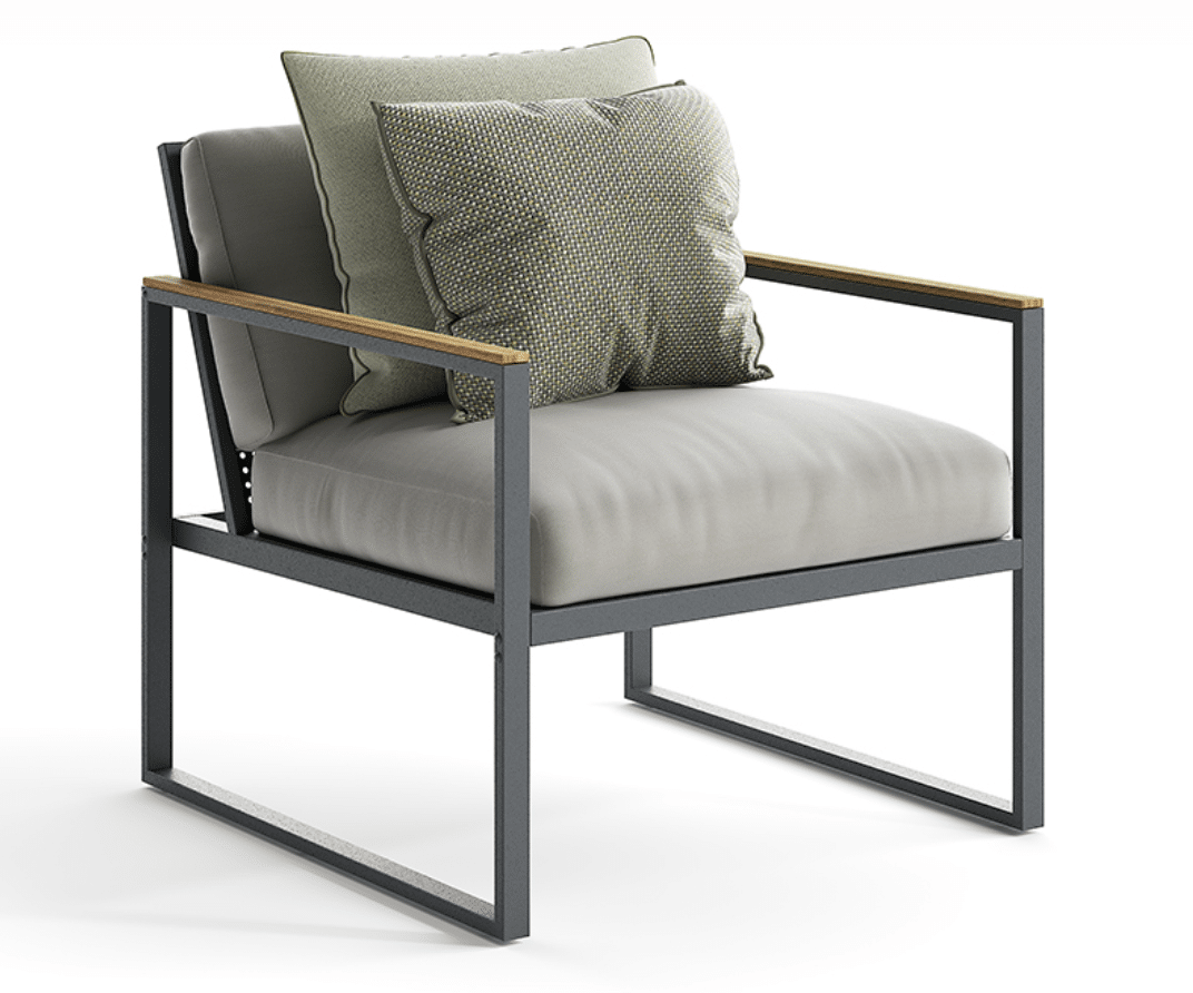 Le facce del cubo evolvono in braccioli rivestiti da dettagli in teak e schienali caratterizzati da lamiere forate.